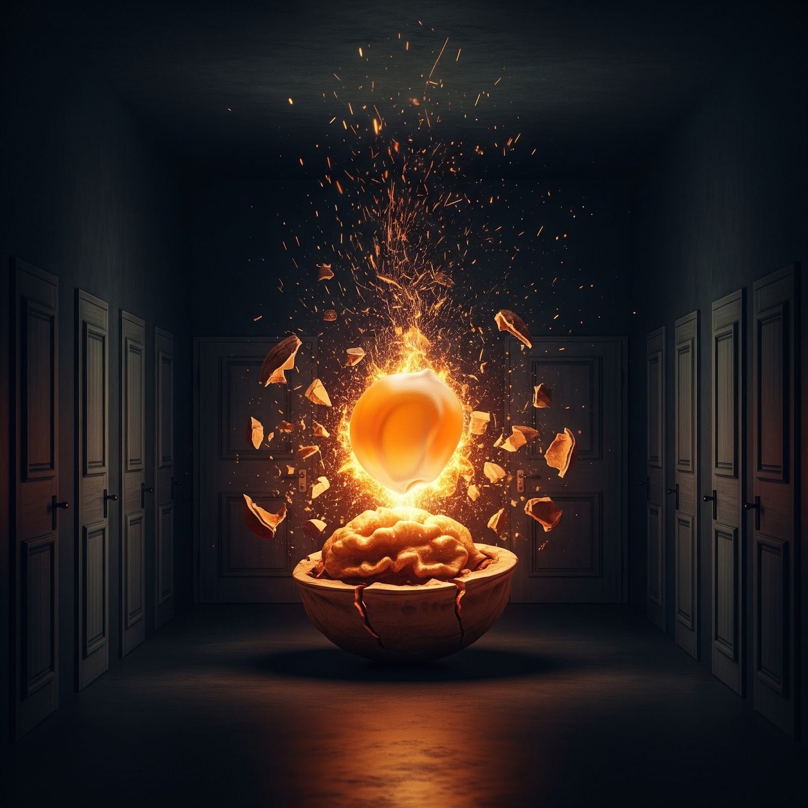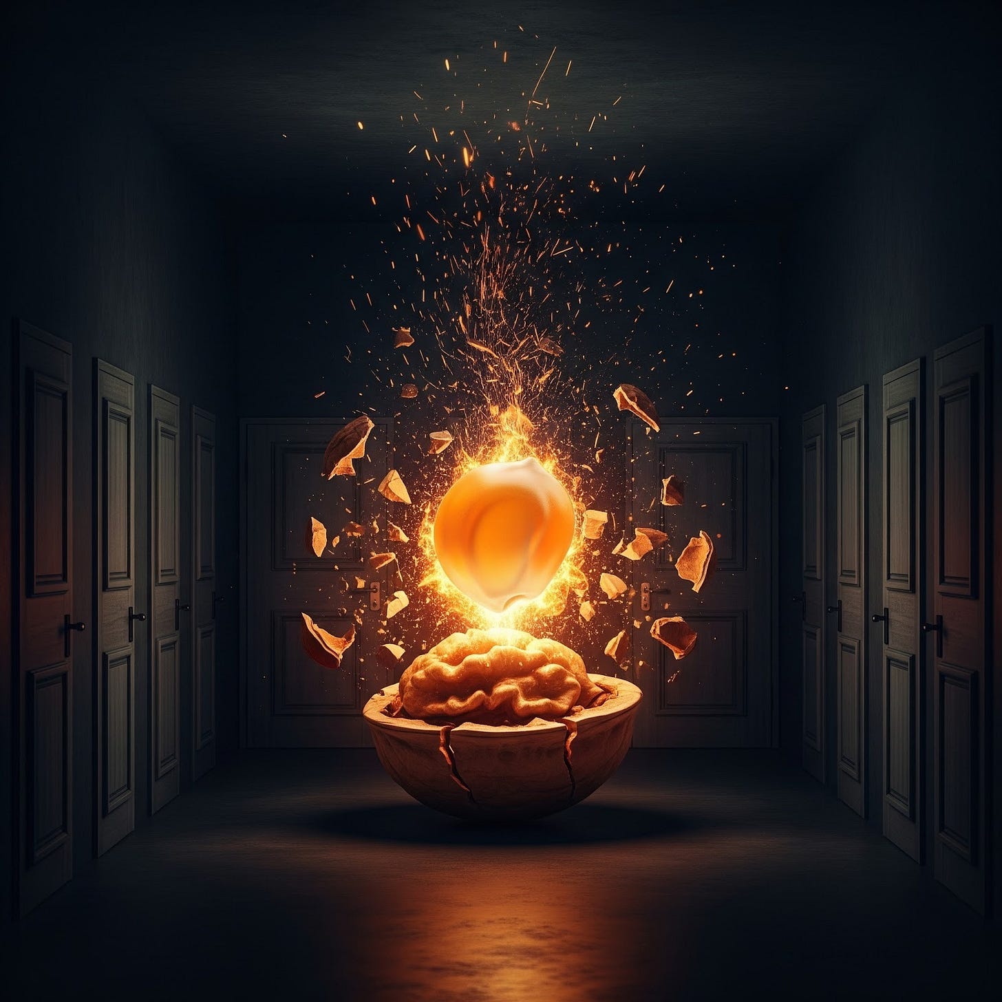 You sealed off your feelings And with them your heart So when your heart swells It blows you apart But you have forgotten That you are the child Who wants to be special And aches to run wild This world is a prison For those who accept it Like a room full of doors With no clearly marked exit And you became trapped In your room full of doors For you simply did what Had been done there before You learned that the room Was a place you were held To the whim of the makers Like a nut in a shell But the pressure was building Inside your cocoon As the heat of frustration Came hard and came soon You bounced off the walls In your room full of doors You bounced off the ceiling And you bounced off the floor In your room full of doors Where your choices abound They had you convinced That your nutshell was sound But you’re not a walnut All content in your shell You’re a kernel of popcorn You explode like all hell